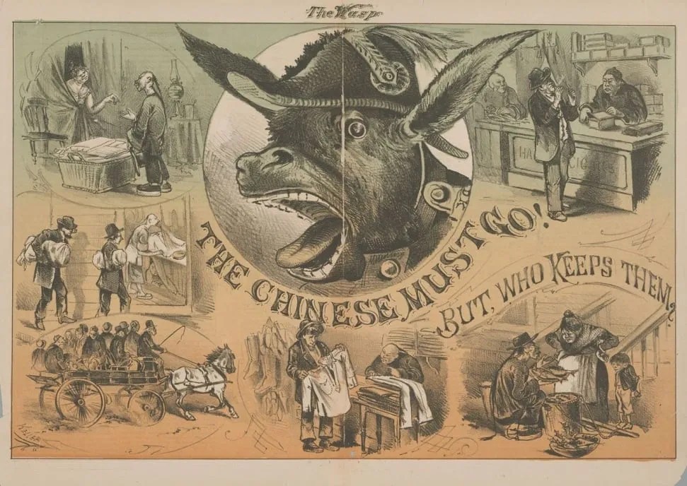 A local anti-Chinese cartoon: “The Chinese Must Go, But Who Keeps Them?” – 11 May 1878 by George Frederick Keller for The San Francisco Illustrated Wasp. Via Thomas Nast Cartoons.