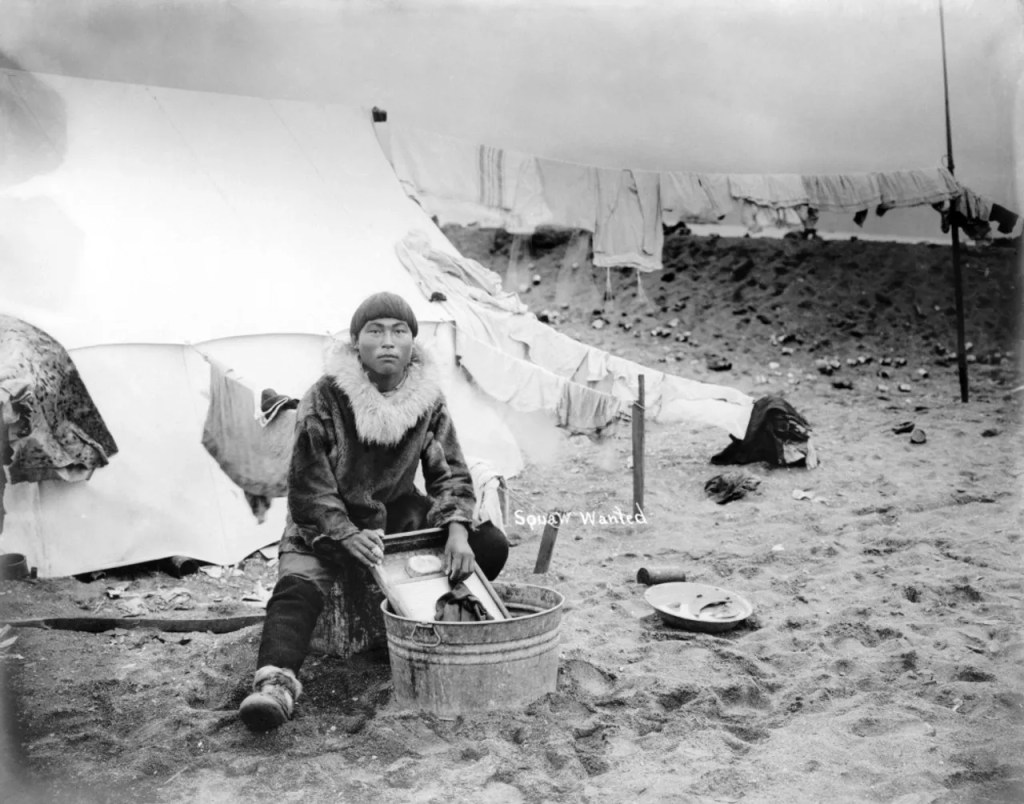 During this period, laundry processes were labor-intensive and required creativity to accommodate limited supplies and frigid conditions. The photograph of the Inuit man washing clothes in a tub outside his tent indicates a blend of traditional practices and adopted methods introduced by Western settlers. Nome, Alaska, became a hub of activity during the Gold Rush, and with it came new technologies and goods, including metal washtubs, soap, and cloth garments.