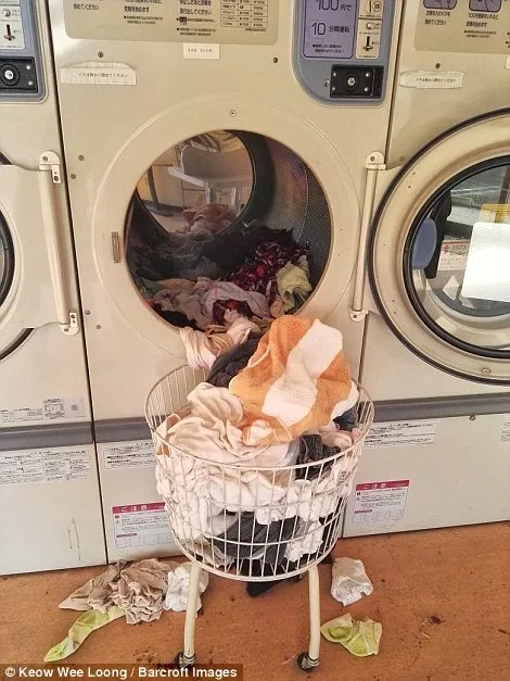 Step inside one of these spaces, and the imagery is both mundane and surreal. Rows of washing machines, some still holding wet clothes, are coated in dust and rust, frozen mid-cycle like snapshots of interrupted lives. It’s easy to imagine the stories behind each load. Perhaps a mother had just dropped her child’s school uniform into the washer, humming softly as she tried to scrape away yesterday’s mud. A salaryman may have tossed his work shirt into a machine before heading home, unaware he would never return. A retiree, fond of routine, could have been folding a favorite sweater, pausing mid-motion to chat with a friend—only to vanish from this world of daily rituals. Each garment, each coin, each basket is a relic of ordinary life made extraordinary by its sudden stillness.