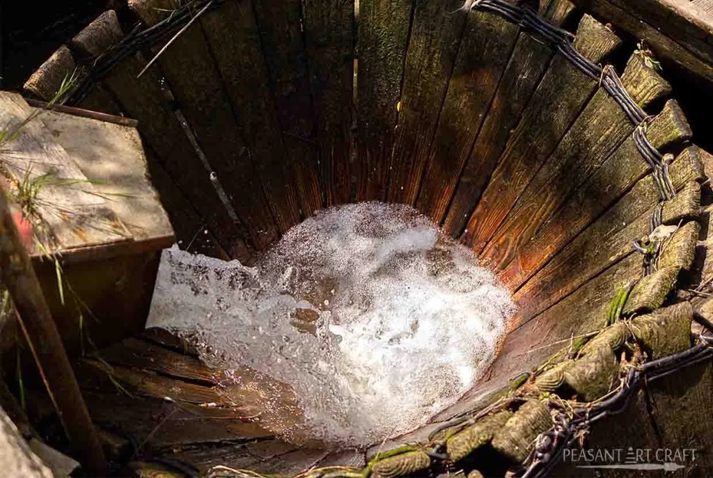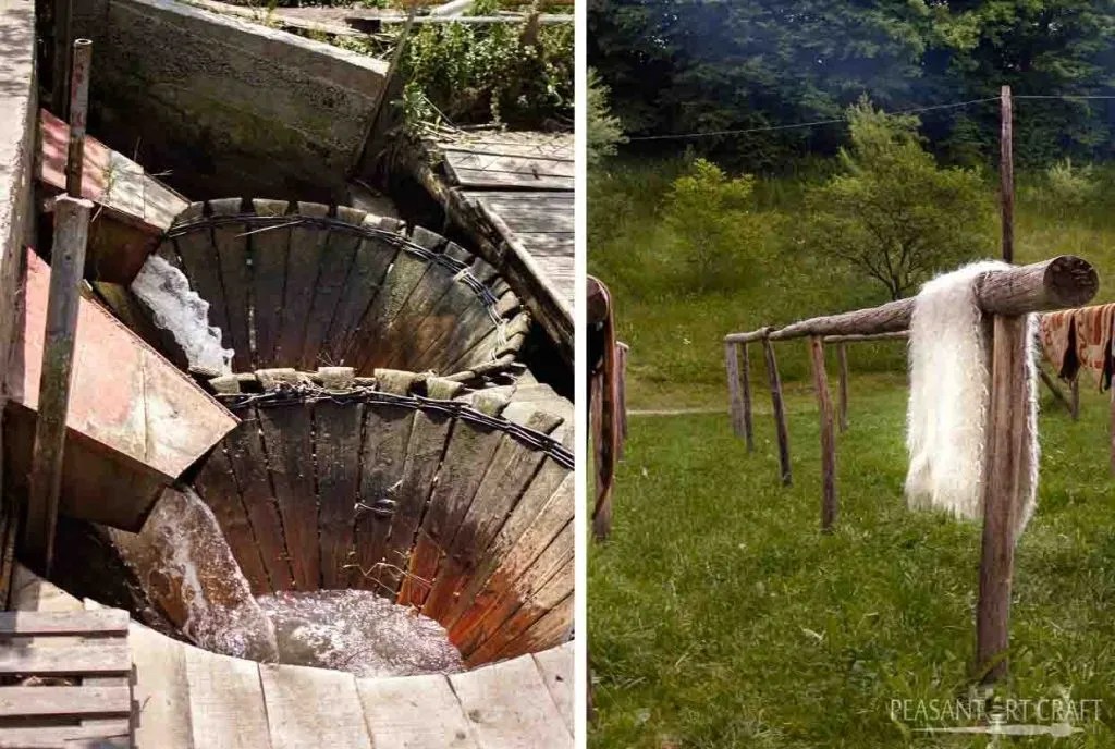 Since old times, weavers were washing traditional Romanian textiles in these whirlpools right after they were removed from the loom. These traditional washing machines were very useful for washing heavy, hard to handle woven fabrics, woolen coats, felt rugs, carpets, without the need for cleaning agents. A heavy fabric would stay at least 10 hours in the washing whirlpool, then taken out and hung to dry on nearby fences.