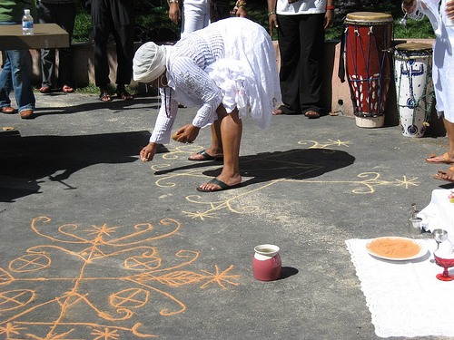 In Haitian Vodou funerary rites, white linens are draped on altars, laid under caskets, and waved during rituals. The dead are honored with washed and consecrated cloth, sometimes embroidered or knotted with symbols. Veves, ritual symbols drawn with cornmeal or chalk, may be outlined on white sheets during spiritual ceremonies.