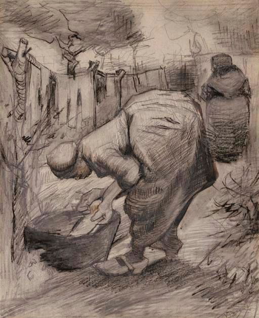 Three years later, in Peasant Woman at the Washtub and Peasant Woman Hanging Up the Laundry (1885), he portrays domestic labor with dignity, aligning washerwomen with farming and community welfare in his Nuenen rural series.